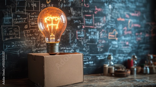 Light bulb in a box against a chalkboard backdrop.