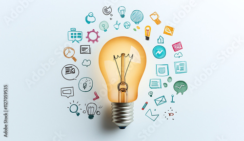 light bulb surrounded by colorful doodles representing ideas, creativity, and innovation. This symbolizes inspiration and brainstorming in modern context