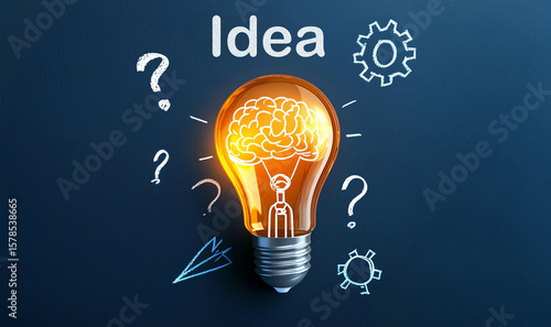 Light bulb with brain illustration symbolizes creativity and innovation, surrounded by question marks and gears, representing problem solving and ideas