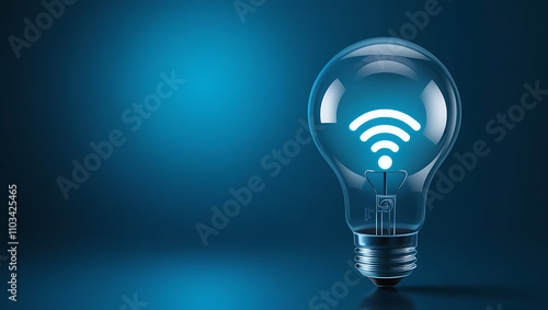 Light Bulb with Glowing Wi-Fi Symbol, Wi-Fi symbol, wireless technology, blue gradient background. Light bulb with wifi symbol is glowing on blue background