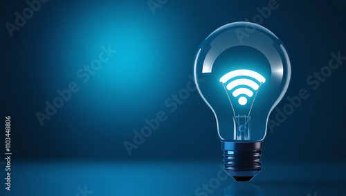 Light Bulb with Glowing Wi-Fi Symbol, Wi-Fi symbol, wireless technology, blue gradient background. Light bulb with wifi symbol is glowing on blue background