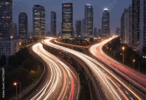 Light flow of traffic on a evening highway in a city with modern high buildings
