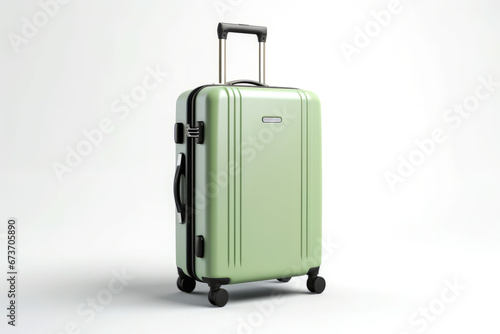 Light green plastic suitcase on wheels with outstretched handle isolated on white background,holiday theme.generative ai