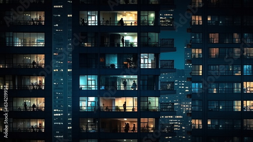 light in night windows,city buildings windows with blurred light and people siluetthe on front ,urban lifestyle