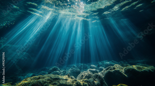 Light rays penetrate the clear water above rocky ocean floor in a tranquil underwater setting