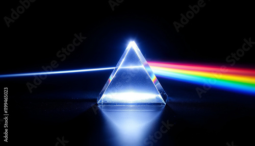 Light refracted through a prism creates a rainbow spectrum on a dark background in a dynamic display of color