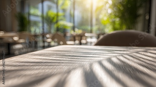 Light wooden table with palm leaf shadow in a cafe. Blurred cafe interior with plants and sunlight streaming through windows