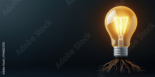 lightbulb ideas strategy transformation concept. A glowing light bulb with roots, symbolizing ideas and innovation emerging from the ground.