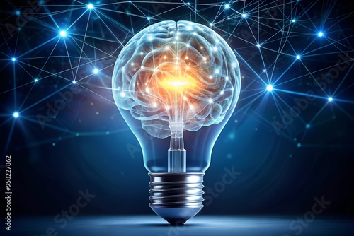 Lightbulb with glowing brain inside on dark blue background. 3D rendering Glowing light bulb with human brain inside on dark background. 3D rendering