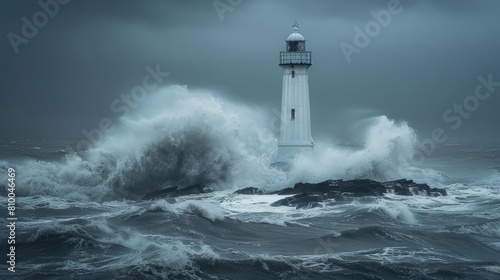 Lighthouse Enduring the Force of Ocean Waves. A picturesque scene of a lighthouse standing on a rugged coastline, bracing against mighty ocean waves amid a tempestuous sky.