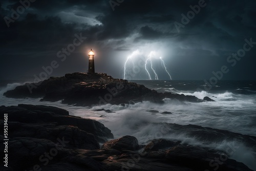 Lighthouse In Stormy Ocean in the night time. Conceptual photography. AI-generated image