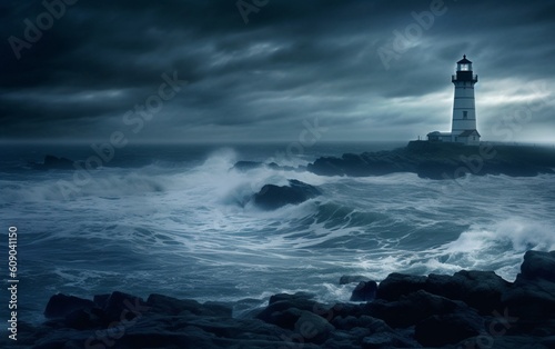 Lighthouse in the Storm: Iconic Beacon Illuminates the Rugged Coastline Amidst Turmoil, Generative AI