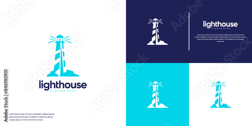lighthouse logo with island rocks, beacon tower, logo design vector.