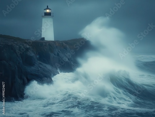 Lighthouse on a rocky coastline with waves crashing against the shore, dramatic atmosphere, wide shot, sharp focus