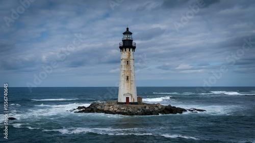 Lighthouse on a Rocky Island Surrounded by the Sea, Evoking Navigation, Coastal Scenery, and Maritime Themes