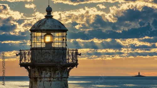 Lighthouse standing against a dramatic sunset sky, casting light over calm waters and distant landforms.