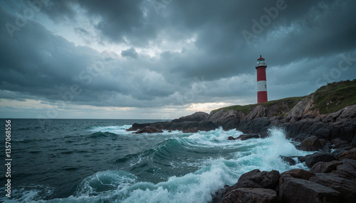 Lighthouse standing strong amidst stormy ocean, resilience in nature, copy space