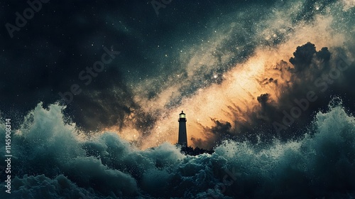 Lighthouse Stands Tall Amidst Powerful Ocean Waves and Starry Sky