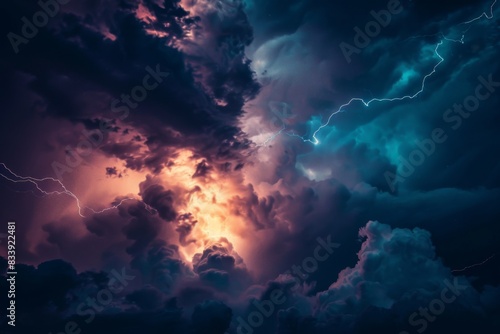 Lightning and thunder clouds in a dark sky with a bright orange glow