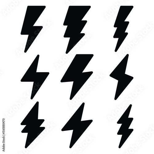Lightning Bolt Icons Set, Black Electric Flash Vector Symbols for Energy and Power Design.