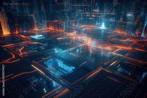 lights of fractal realms, neon red and blue room, abstract futuristic cyber space design, generative ai