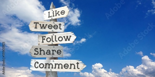 Like, tweet, follow, share, comment - wooden signpost with five arrows