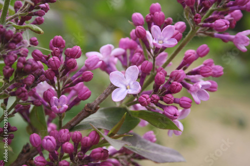 Lilac blossoms and flowers on branch in springtime. Syringa vulgaris in bloom
