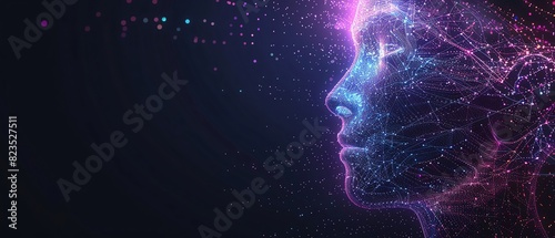Lilac color digital hologram futuristic face neuron link on a neuron connection, Artificial intelligence concept, isolated on black background
