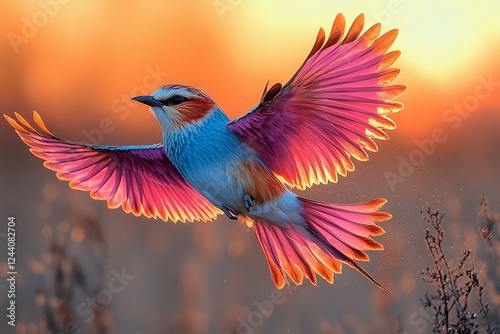 Lilac-breasted roller bird diving with wings spread in natural habitat in vibrant colors
