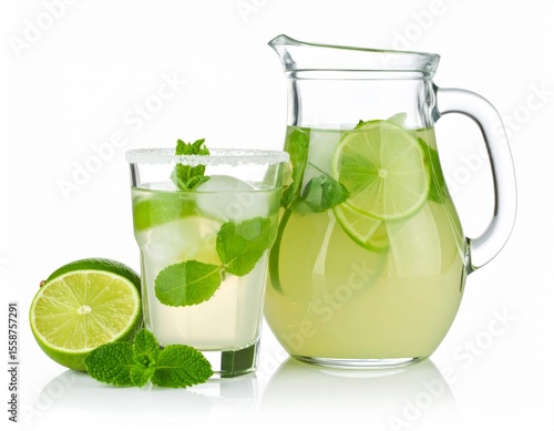 Lime and mint lemonade in pitcher and tumbler with sugared rim on reflective white background, clean and bright summer drink concept.
