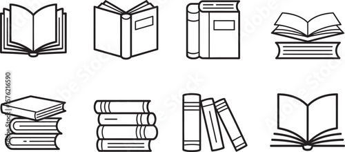 Line Art Book Icons Set – Open, Closed, and Stacked Books Vector Collection
