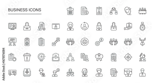 Line art business symbols representing various office tasks and management processes on a clean white backdrop, conveying professionalism.