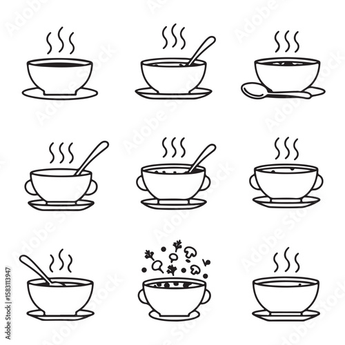 Line Art Depiction of Steaming Soup Bowls Assorted with Spoons and Toppings Providing Culinary Simplicity and Warmth in an Elegant Minimalist Style