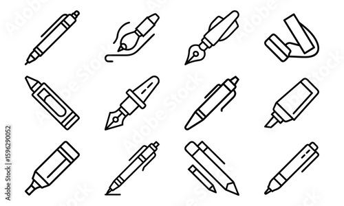 Line Art Icons of Writing and Drawing Tools Including Pens, Pencils, Markers, Paint Brushes, Fountain Pens, and Erasers for Stationery and Creative Design