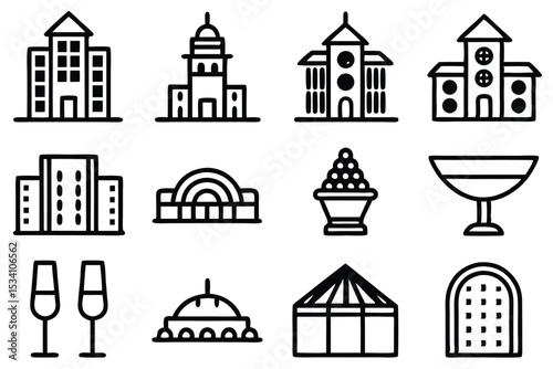 Line art icons representing architecture celebration and festive elements collection