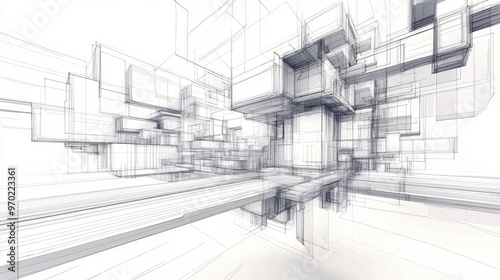 Line art illustration depicting an abstract structure featuring a three dimensional architectural design