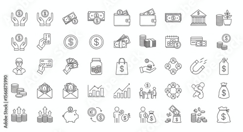 Line art illustration featuring various financial icons and symbols on a white background design set