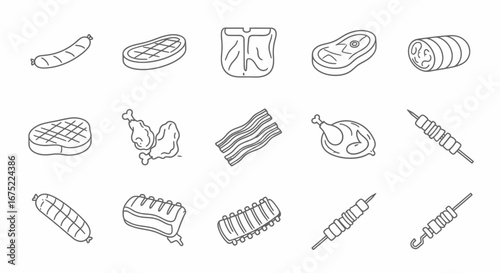 Line art illustration showcasing various meats including sausage, steak, T-bone, bacon, chicken, ribs, and skewers, arranged in a neat grid.