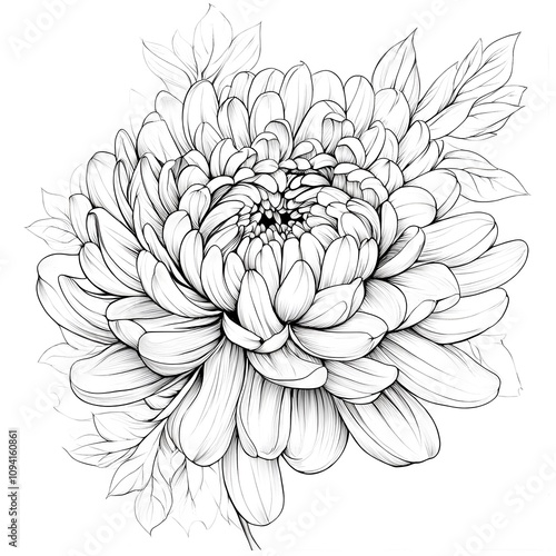 Line art of a chrysanthemum, showcasing detailed petal layering and a bold center design