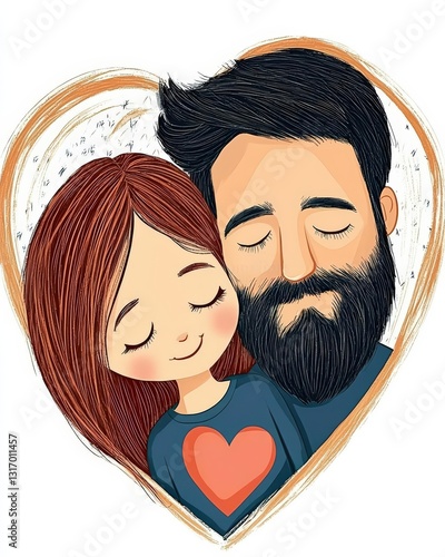 Line art of a father and child with a heart-shaped frame around them, Father's Day concept, soft and flowing lines, focus on love and connection