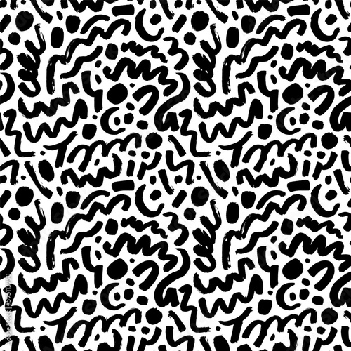 Line doodle seamless pattern with blobs. Hand drawn curved brush strokes and dots. Creative abstract style art background. Expressive seamless vector pattern. Messy doodles, bold curvy lines.