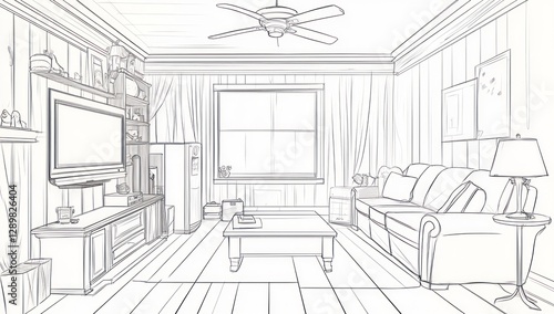 Line drawing of a rustic living room with a large TV, sofa, and fireplace.