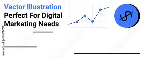 Line graph with upward trend and blue dollar sign icon. Ideal for finance, analytics, marketing, entrepreneurship, business planning, data visualization, and flat landing page banner