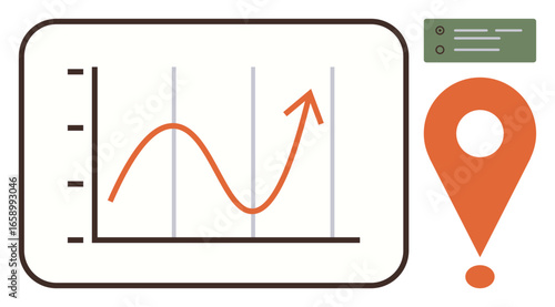 Line graph with upward trend, orange map pin, and bullet-point checklist visualizing success, navigation, and organization. Ideal for data analytics, growth, strategy, planning location progress