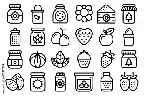 Line icon set featuring a jam jar with strawberries isolated on transparent background