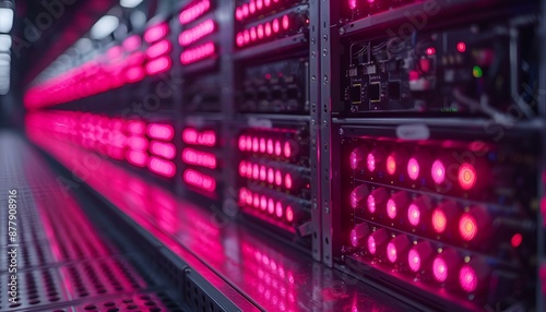 Line of servers illuminated by pink lights, indicating active status..