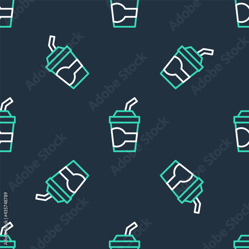 Line Paper glass with drinking straw and water icon isolated seamless pattern on black background. Soda drink glass. Fresh cold beverage symbol. Vector