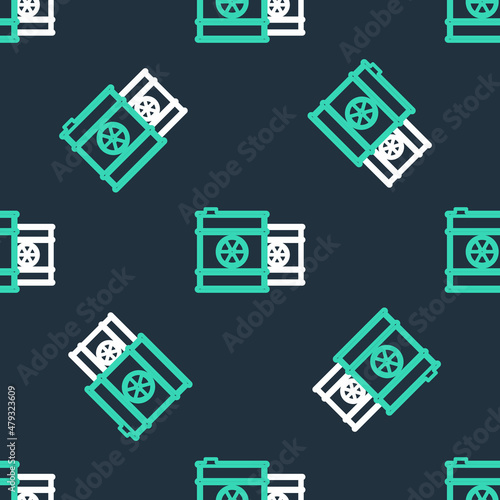 Line Radioactive waste in barrel icon isolated seamless pattern on black background. Toxic refuse keg. Radioactive garbage emissions, environmental pollution. Vector