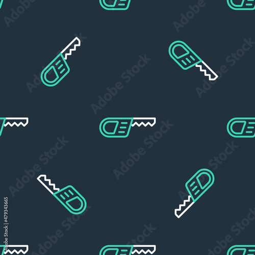Line Reciprocating saw and saw blade icon isolated seamless pattern on black background. Vector