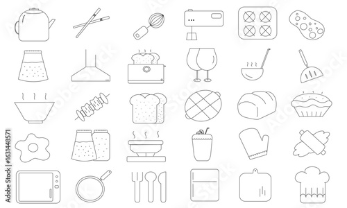 Line style icon set for kitchen and cooking — featuring kitchenware, food, desserts, and drinks. Vector illustrations